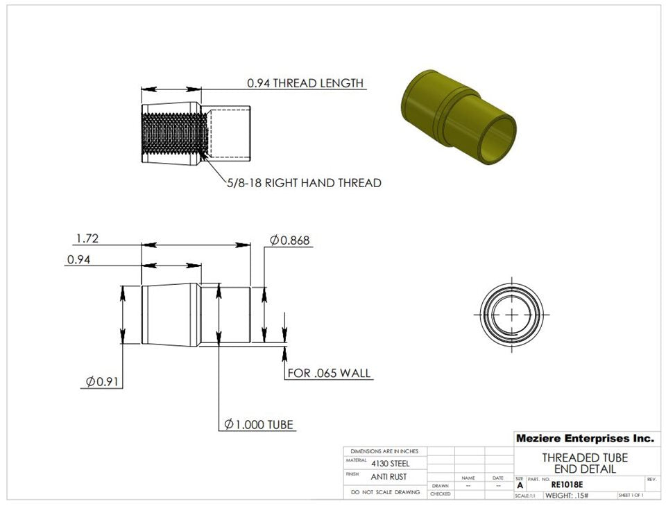 Rohrende, passend für 1" x .065 Rohr, 5/8-18 Gewinde